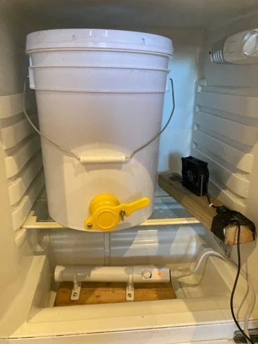 A tube heater is handy for warming. Purchase one that does not have a thermal cutout. I’ve used a 60W Thermotube tubular heater, and use a heat shield (not shown). It must be used with a thermostat. I have drilled a hole in the door of the fridge for a thermometer. A computer fan with a USB connection circulates warm air. Many people adapt Chest freezers.