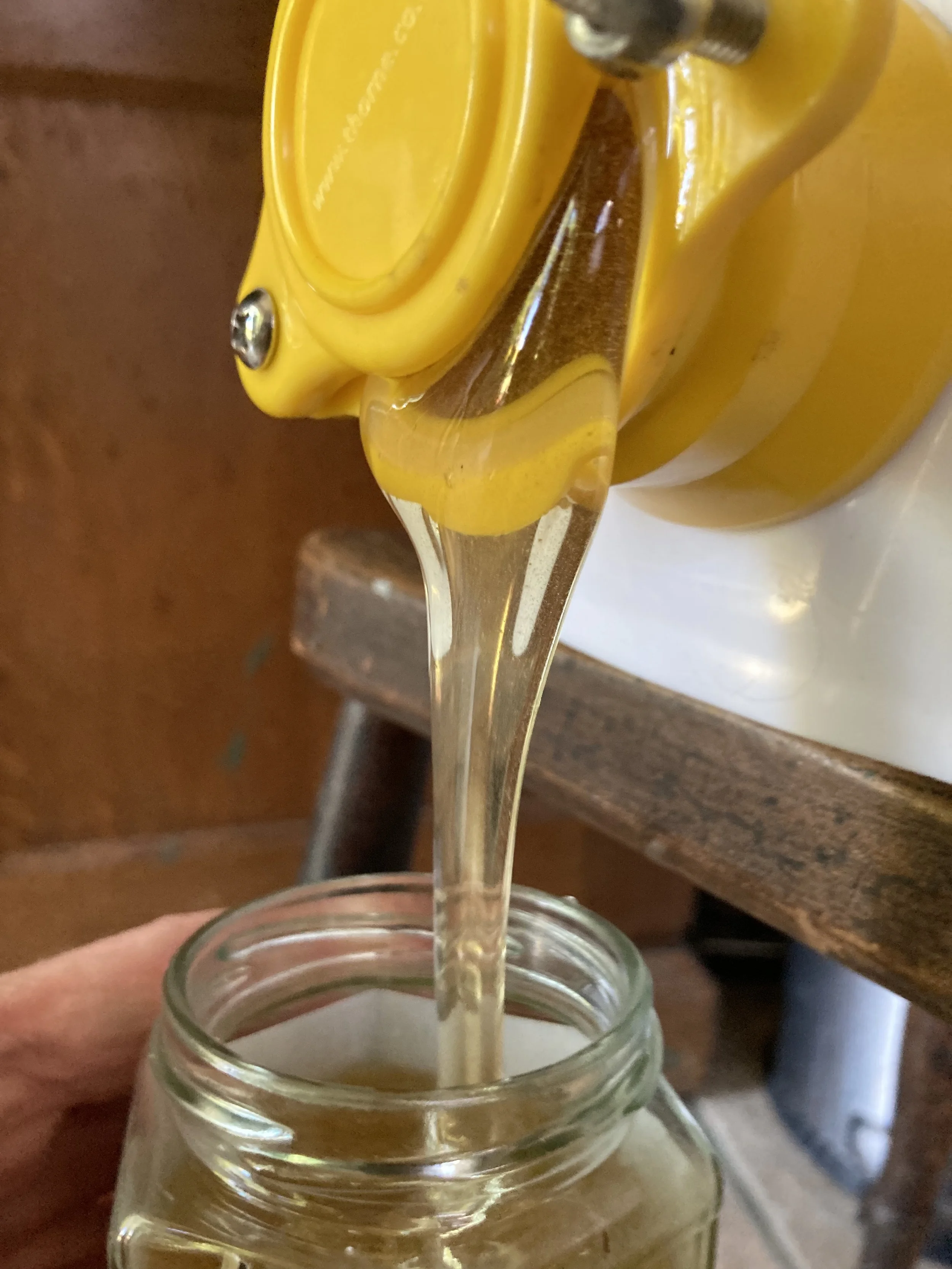 Harvesting involves removing the bees from the frames (clearing), slicing off the caps on the honey comb (uncapping) and spinning the frames so that the honey comes out under centrifugal force (extracting). Harvesting generally takes place after the main nectar flow. In Southern England this was historically in early August, but in 2025 it was mid-July.